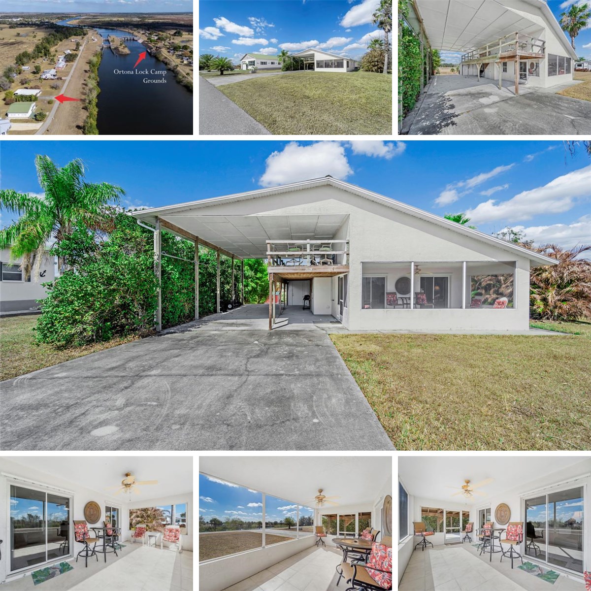 RV-Port House with Full Hook-Ups | River Views Near Ortona Locks This concrete block home with a metal roof offers scenic views of the Caloosahatchee River and historic Ortona Lock, providing the benefit of riverfront living without the added tax burden of direct waterfront ownership. Located along the Caloosahatchee River—the intracoastal waterway connecting Florida’s east and west coasts—you can enjoy passing boats, colorful sunsets, and peaceful water views from the screened front lanai and elevated upper deck. Designed for a variety of homeowners, including RV enthusiasts, seasonal residents, and full-time occupants, this 2-bedroom, 2-bath residence sits on a .43-acre lot and features an oversized RV port with full hook-ups, accommodating large Class A motorhomes, fifth wheels, campers, and travel trailers. The covered structure provides protection and convenience for your recreational vehicle and is also ideal for keeping a boat sheltered under the roof of the port, adding flexibility for both land and water enthusiasts while maintaining the comfort and character of a traditional single-family home. Outdoor living is a defining feature, highlighted by a fully screened, south-facing lanai that captures cool breezes and river views. The upper viewing deck provides an elevated vantage point to watch boats travel along the Caloosahatchee River while enjoying beautiful sunrises and sunsets. The private guest bedroom and bath include a separate entrance and screened lanai, ideal for multi-generational living, extended guests, or added privacy. River access is approximately 100 yards away at the Ortona Lock Boat Ramp, a free public ramp and day-use park located at the end of Lock Lane. Enjoy excellent fishing, boating, and miles of nearby walking and biking opportunities. High-speed fiber optic internet is available. Conveniently located about 15 minutes from LaBelle, with easy access to State Road 29 and U.S. Route 27, this property offers a quiet rural setting with practical connectivity. An additional .48-acre adjacent lot is available under specific terms: the seller will sell the home alone or together with the lot; however, the vacant lot will not be sold separately prior to the home sale. This presents a unique opportunity for expansion or added privacy.